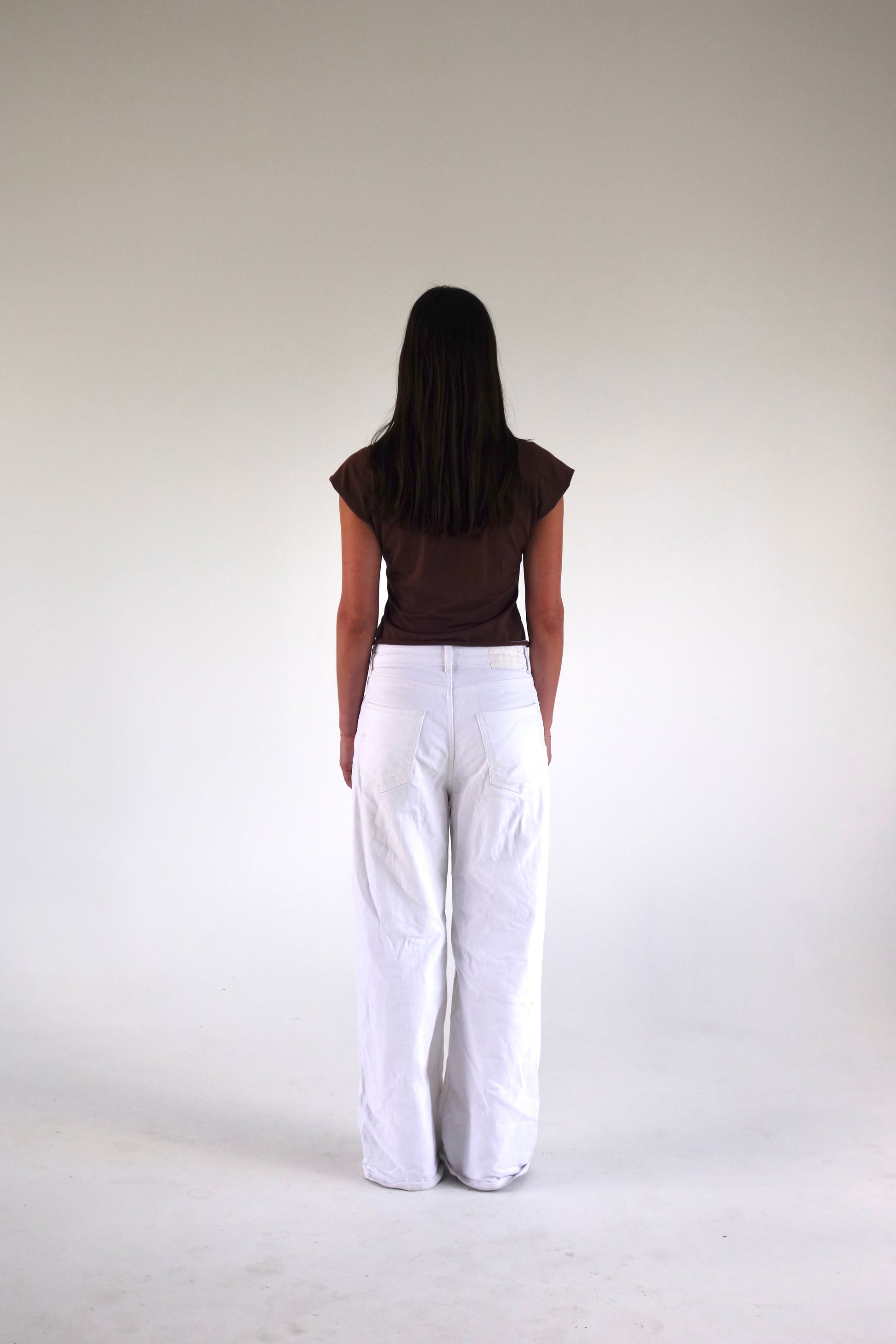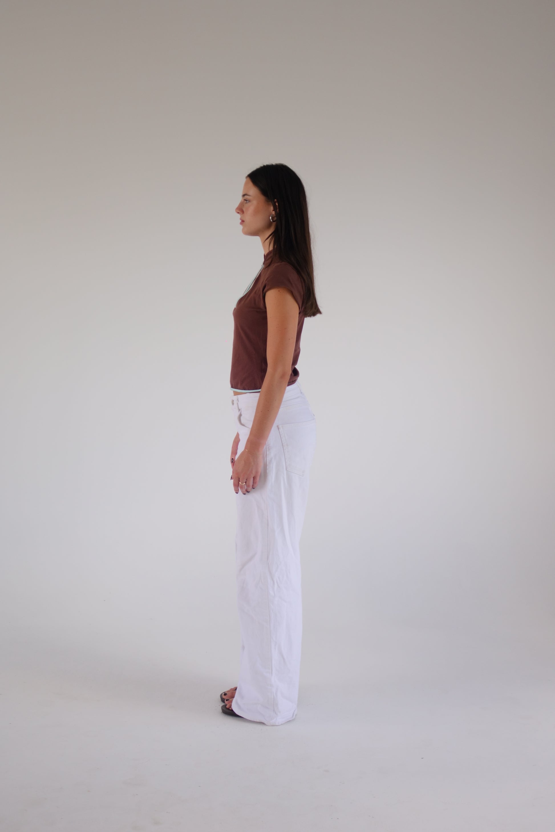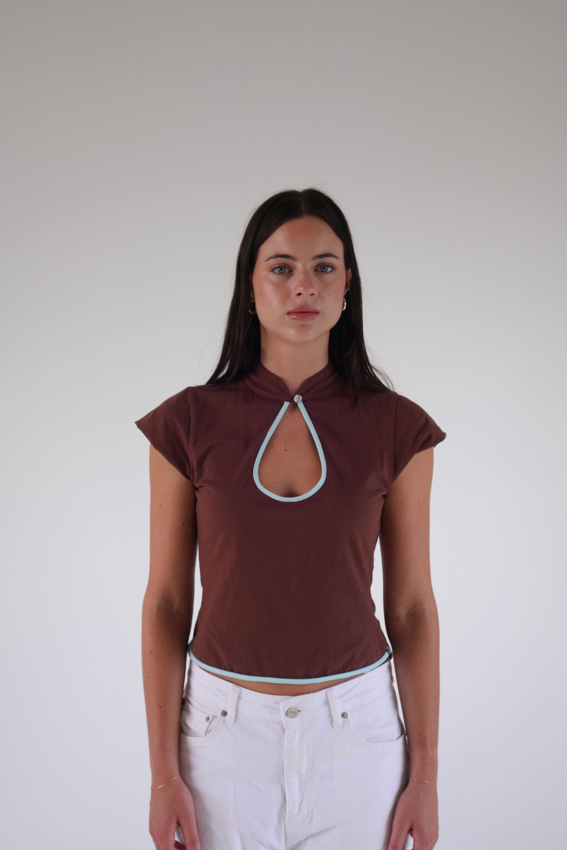 Made from a soft chocolate cotton jersey, the Phoebe top's keyhole neckline and hem is contrasted with a teal trim. Featuring a small button detail and cap sleeves, the Phoebe is designed to embody an elevated basic that is unique and stunning.